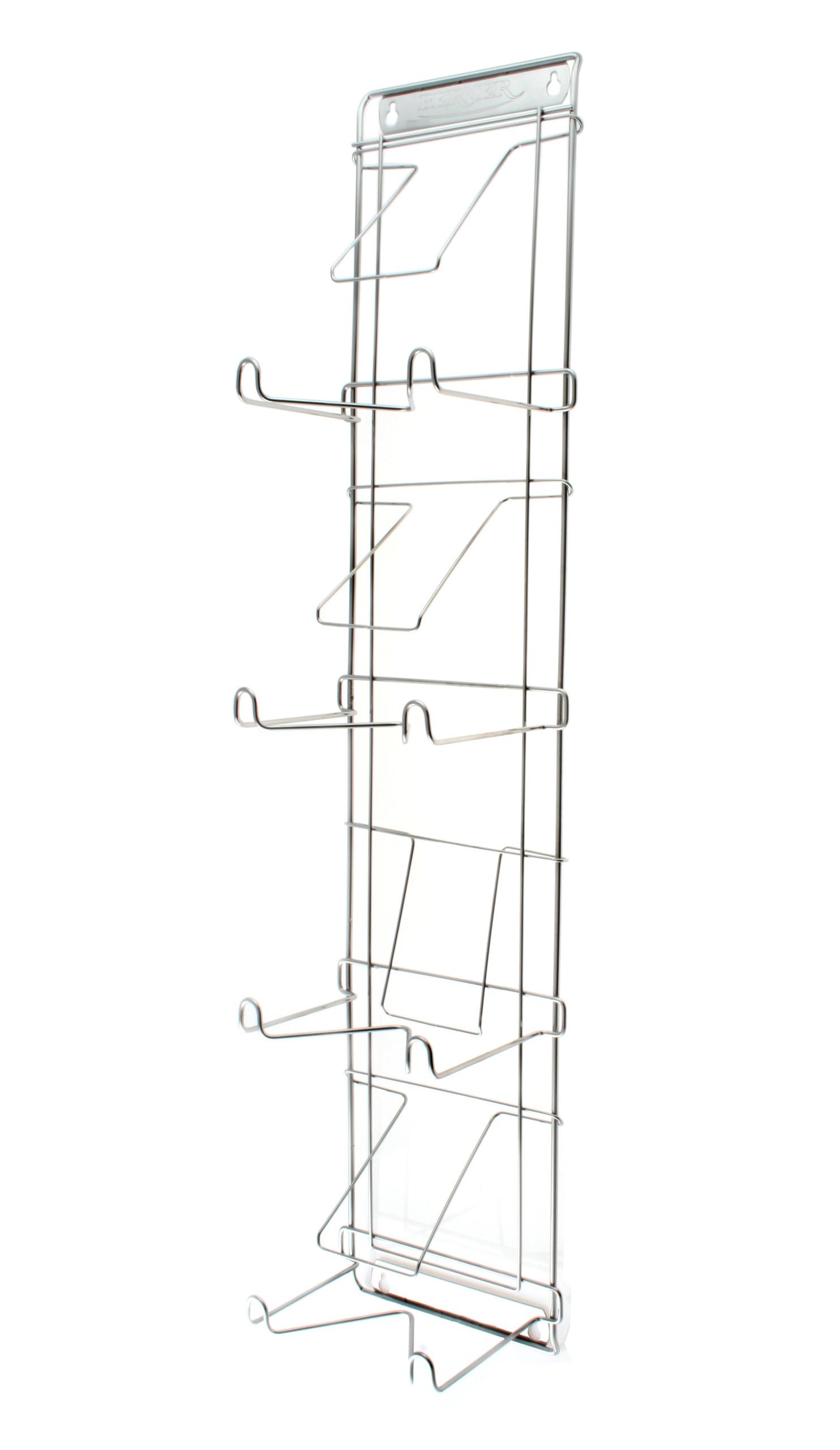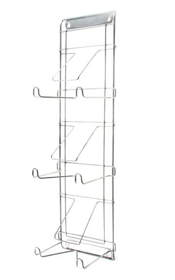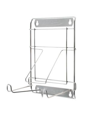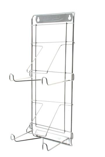 Rostfri vägghållare för kartongförpackningar. Ett enkelt och mycket hygieniskt sätt att hålla ordning på förpackningar med exempelvis engångshandskar, munskydd och förkläden. Med hjälp av fjädrande byglar är kartongstället flexibelt vilket gör det anpassningsbart efter kartongstorleken. Tack vare fästplåtarnas utformning lossar man enkelt ställningen från väggen vid t ex sterilisering.